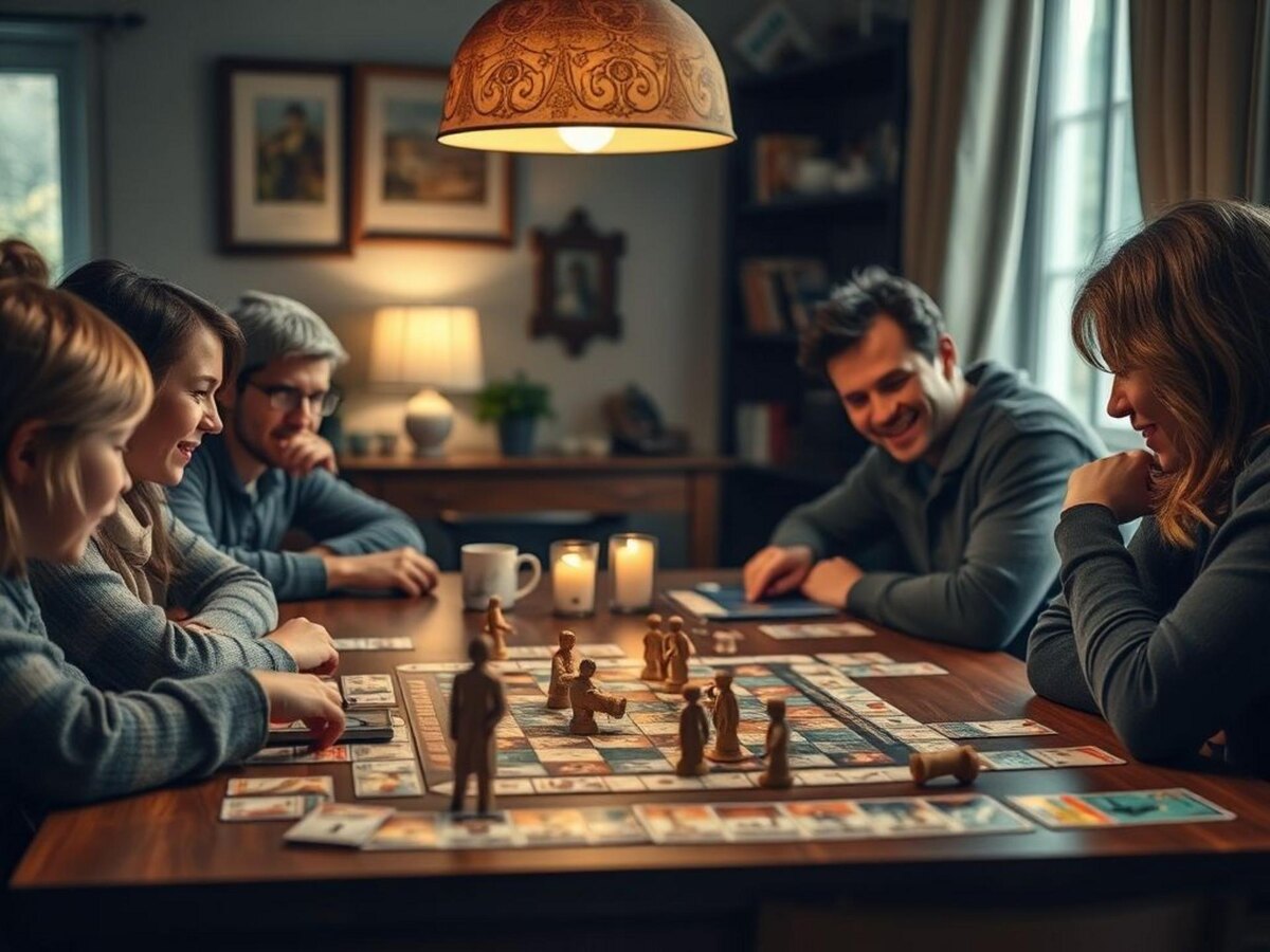 Семейный вечер за столом с настольными играми, уютная атмосфера, деревянные фигурки и карты, мягкий свет лампы