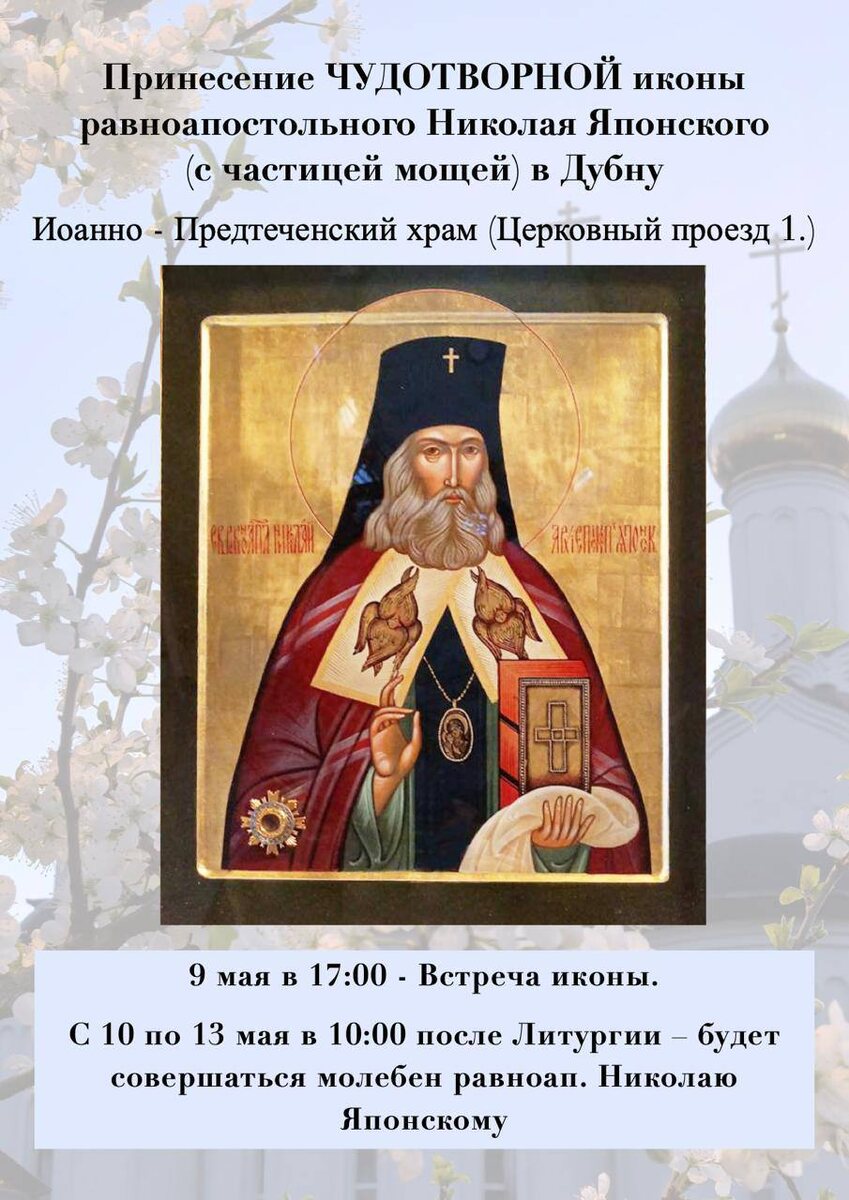 🙏Чудотворная икона равноапостольного Николая Японского (с частицей мощей) прибудет в Дубну 9 мая Встречать ее будут в 17 часов храме Рождества Иоанна Предтечи (Церковный проезд, 1.) С 10 по 13 мая в 10:00 после литургии – будет совершаться молебен равноапостольному Николаю Японскому Молясь на икону Николая Японского можно получить помощь при неверии и маловерии родных и знакомых, в учебе, при вразумлении и обращении язычников и атеистов. @Телеканал «Дубна»