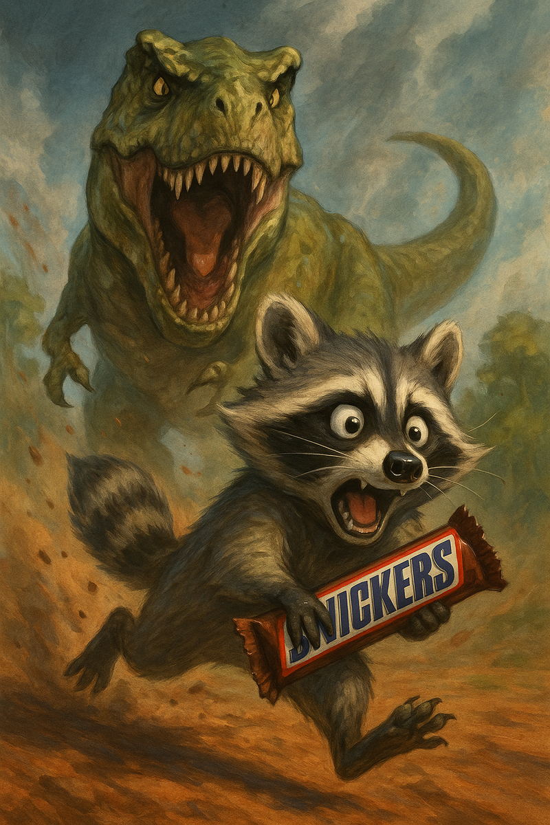 Он бежит что есть силы, сжимая в лапах огромный батончик Сникерса, как сокровище. За ним — Тираннозавр.