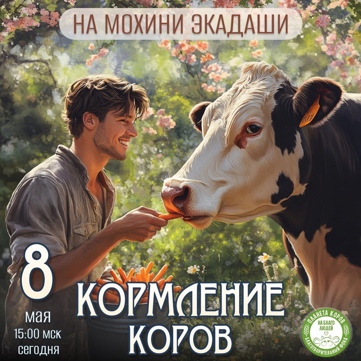 Дорогие друзья❤ Сегодня 🗓 8 мая ⏰ 15:00мск. ️в день МОХИНИ ЭКАДАШИ, мы приглашаем вас накормить коров в прямом эфире во благо ваших близких, во благо всех живых существ🙏❤ Слава этого могущественного дня описана в древних священных трактатах: "Благодаря соблюдению этого экадаши все следствия греховных поступков, материальные страдания и всяческие иллюзии разрушаются!" И сегодня четверг! Если в четверг, с любовью накормить коров рисовыми пудингами, то разрушаются следствия всех накопленных в прошлых жизнях греховных поступков! Это двойное благословение, друзья! В Экадаши плоды благих дел усиливаются многократно! Поэтому мы, спешим готовить рисовые пудинги для коров, а вы пишите имена в чат бот, всех тех для кого вы желаете счастливой жизни⬇️ https://t.me/Planetaofcowsbot Благотворительность в такой день окажет мощное влияние на позитивные изменения в судьбе! Помогая коровам мы помогаем себе, своим предкам и своим потомкам. Здоровые, счастливые коровы = здоровая, плодородная земля =