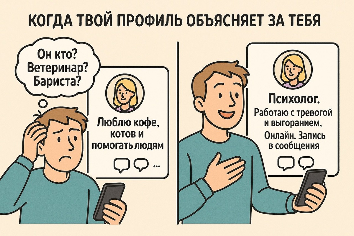 — Описание: «Помогаю найти гармонию» — а клиент не понимает, при чём тут его тревожность и бессонница