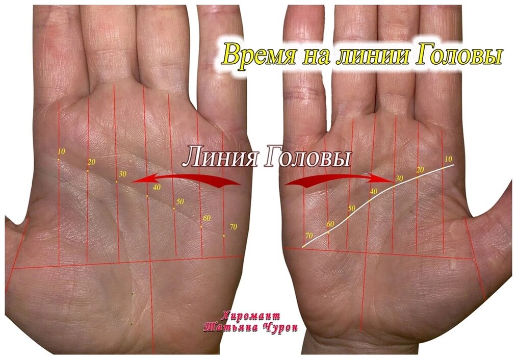 Линия головы (ума) – это вторая главная линия на руке, которая начинается со стороны большого пальца, над линией Жизни и продолжается поперек ладони. Она связана с умственной деятельностью человека, поэтому ее еще называют линией Ума. Данная линия отвечает за качественную направленность мыслей и желаний человека, стиль его мышления, о болезнях и травмах головы и глаз, а также о возможностях фантазии и воображения, склонности к меланхолии, депрессиям и даже о раздвоении личности. На физическом уровне по линии Головы можно понять о работе головного мозга и состоянии нервной системы человека. На психологическом уровне линия показывает образ мышления, уровень интеллекта человека, глубину памяти, стойкость в достижении успеха и умении сконцентрироваться на решении поставленных задач. Чтобы определить время на линии Головы, необходимо применить датировку, для наглядности можно посмотреть на рисунок и приблизительно вычислить время события. Услуги хироманта, консультация, обзор, датирова