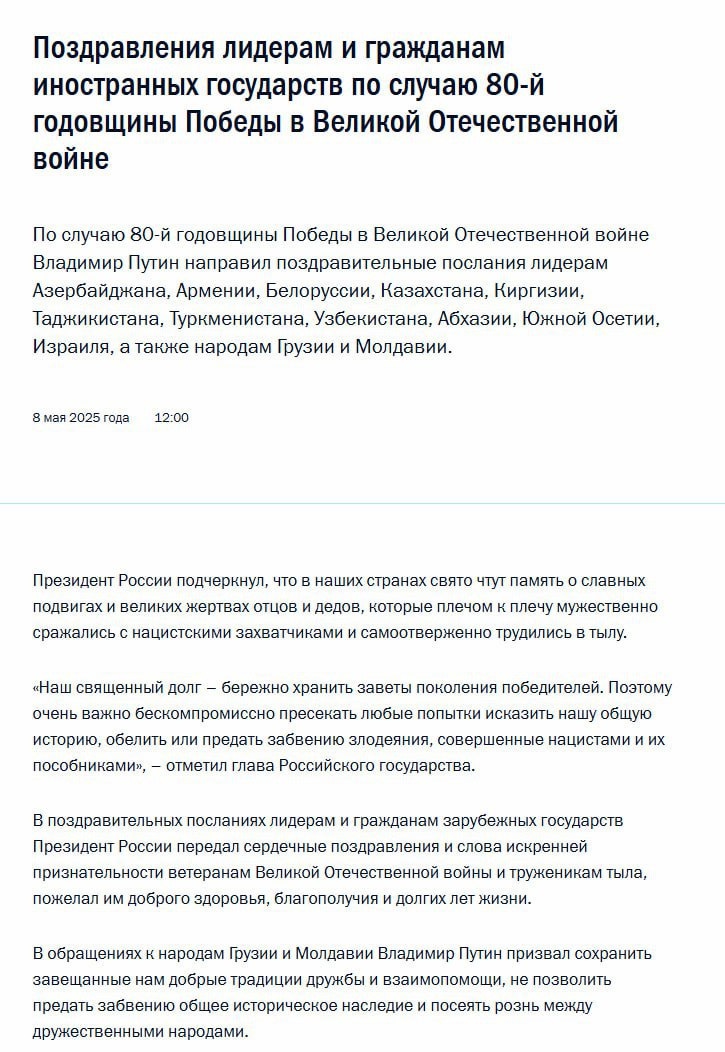 Путин по случаю годовщины Победы направил поздравления лидерам бывших республик СССР, Израиля, а также народам Грузии и Молдавии. «Наш священный долг — бережно хранить заветы поколения победителей. Поэтому очень важно бескомпромиссно пресекать любые попытки исказить нашу общую историю, обелить или предать забвению злодеяния, совершенные нацистами и их пособниками», — отметил президент РФ. ⭕ Подписаться | Прислать новость | Буст