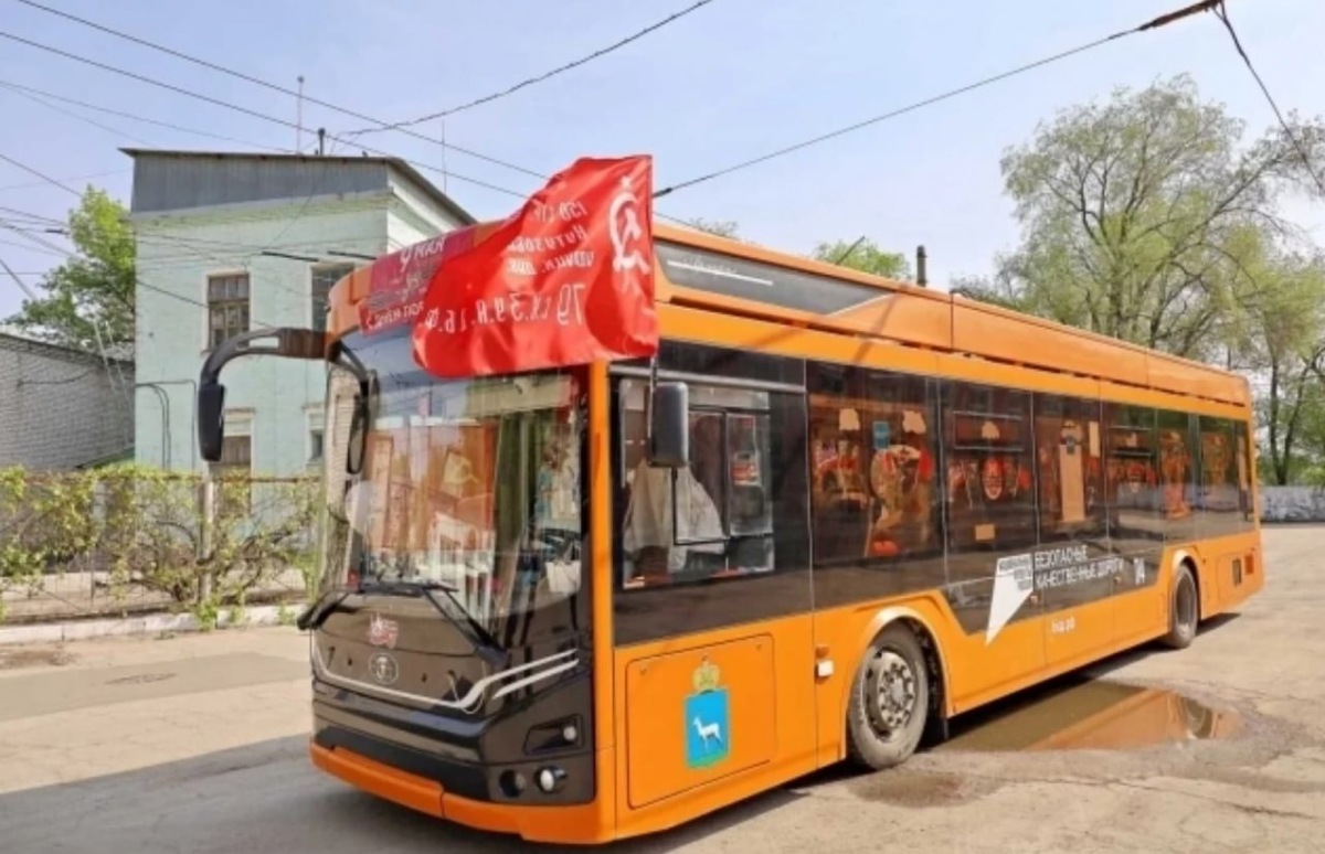 В Самаре ко Дню Победы украсили троллейбус. Городской департамент транспорта поделился кадрами оформления общественного транспорта к