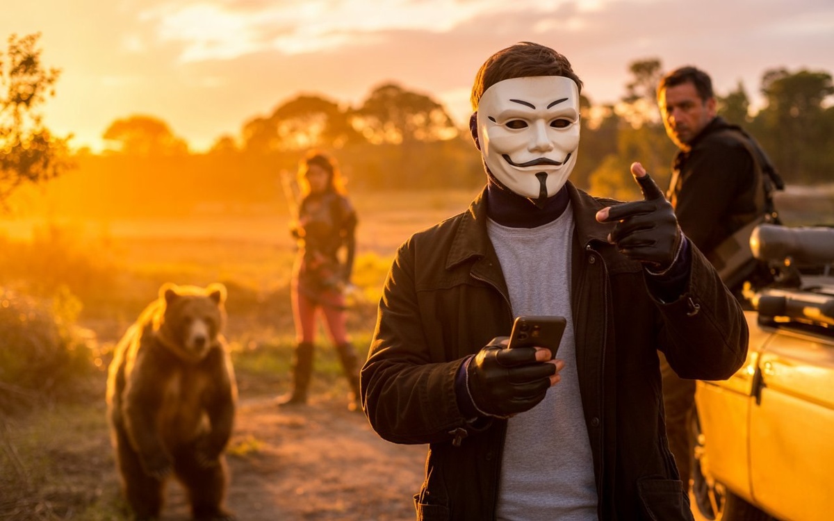 По сюжету звонок мошенника попадает к человеку, который в данный момент находится на охоте, в лесу, испытывает некоторые сложности со связью, идентификацией следов непонятных зверей и ловлей приятеля (который Лёха) при падении в болото.
