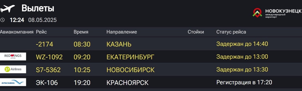 Рейс S7-5361 находится в аэропорту вылета (Новосибирск), рейс N4-753 из Казани ушел на запасной аэродром в Новосибирск. Самолет рейса WZ-1092 Иркутск-Новокузнецк-Екатеринбург находится в аэропорту Новокузнецк.