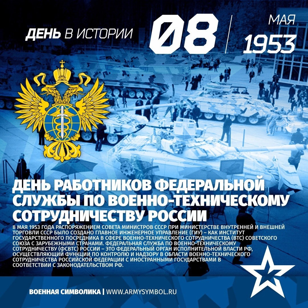 День ФСВТС Федеральная служба по военно-техническому сотрудничеству России Свой профессиональный праздник работники данной Службы отмечают 8 мая. Эта дата выбрана не случайно. Именно 8 мая 1953 года распоряжением Совета Министров СССР при Министерстве внутренней и внешней торговли СССР было создано Главное инженерное управление (ГИУ) – как институт государственного посредника в сфере военно-технического сотрудничества (ВТС) Советского Союза с зарубежными странами. #ПамятныеДатыВоеннойИсторииОтечества #ДеньВИстории #ГодЗащитникаОтечества #80ЛетВеликойПобеды Источник: https://vk.com/wall-60767131_30595 Подпишитесь на наши группы ВКонтакте и в Одноклассниках - читайте, смотрите и комментируйте! Источник