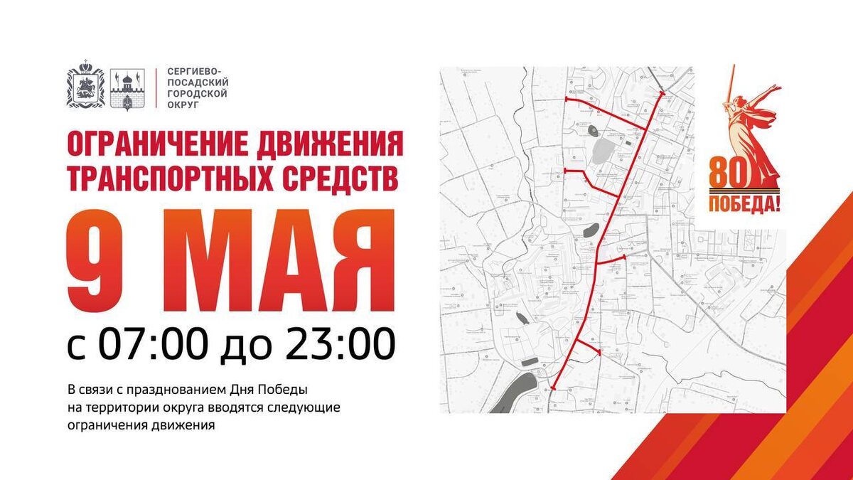 Ограничение движения транспортных средств в Сергиево-Посадском округе 8 и 9 мая В связи с празднованием Дня Победы на территории округа вводятся следующие ограничения движения транспортных средств: ❗️8 мая с 8:00 до 9 мая 23:00 будет закрыт въезд на парковку, расположенную на Пожарном переулке со стороны ул. Пионерская, и на площадку у д. №180 по пр-ту Красной Армии со стороны проспекта. ❗️С 20:00 8 мая до 23:00 9 мая будет закрыт въезд на площадку у отеля «Посадский». ❗️9 мая с 7:00 до 23:00 будет ограничено движение: — по пр-ту Красной Армии от поворота на Новоугличское шоссе до поворота на ул. Ильинская; — по ул. Сергиевская на участке от пр-та Красной Армии до ул. Вознесенская; — по ул. Карла Маркса до пересечения с Овражным переулком; — по автомобильной дороге «Воскресенский проезд» на участке от ул. 1-ой Ударной Армии до пр-та Красной Армии; — по Зелёному переулку на участке от ул. 1-ой Ударной Армии до пр-та Красной Армии. ❗️9 мая с 7:00 до 23:00 будет запрещена стоянка ав