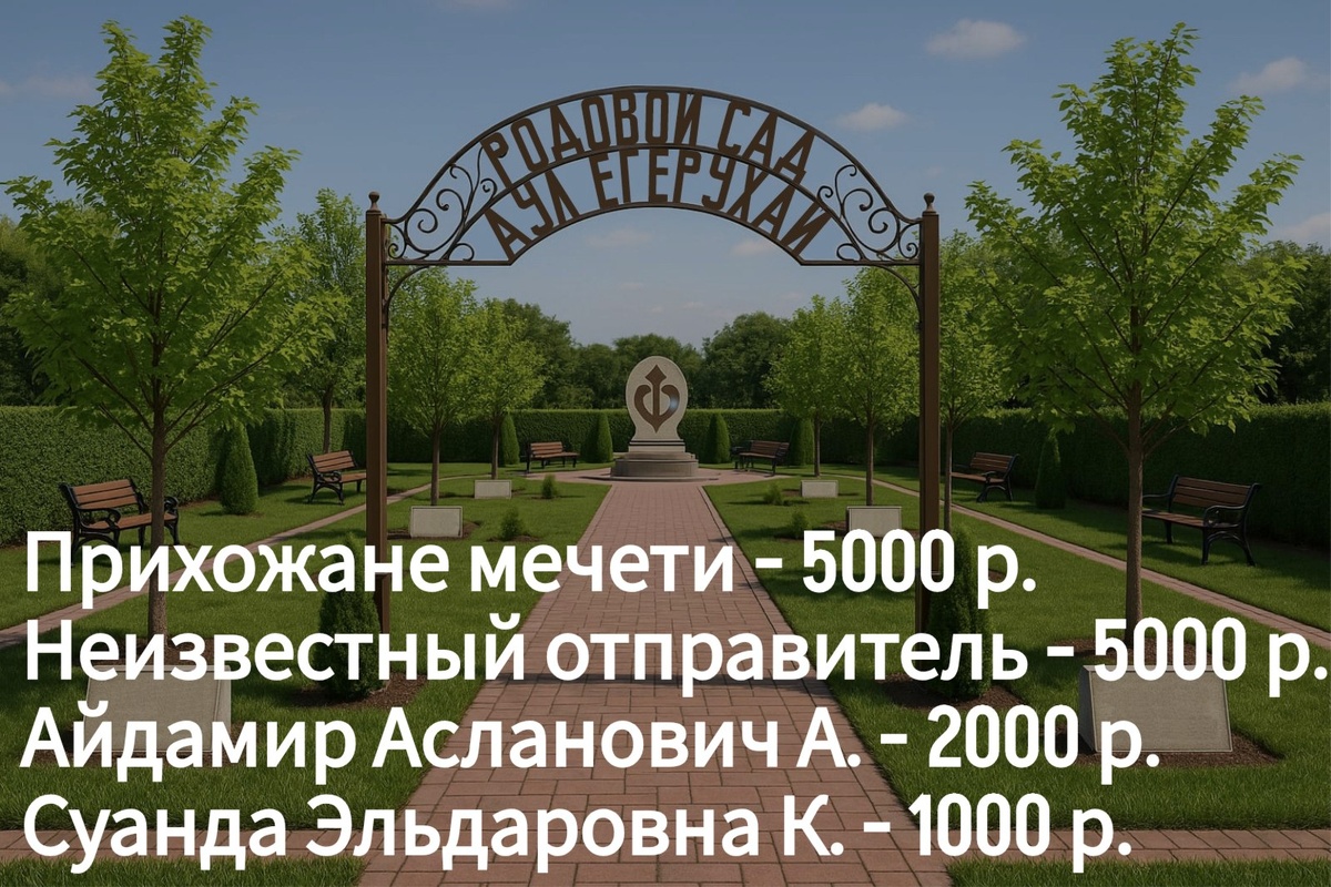 Поступления денежных средств от жителей и выходцев аула Егерухай на реализацию проекта Родового сада. Благодарим всех за оказанную помощь и поддержку! Выражаем надежду, что и другие жители нашего аула также проявят активную гражданскую позицию. Напоминаем, денежные средства можно перечислить по номеру карты Сбербанка: 2202 2002 3860 9869 (Амин Нурбиевич Д.) Также можно осуществить перевод по номеру телефона: 8-918-220-58-95 На имя Амина Нурбиевича Д. В сообщении укажите: Благоустройство Родового сада.