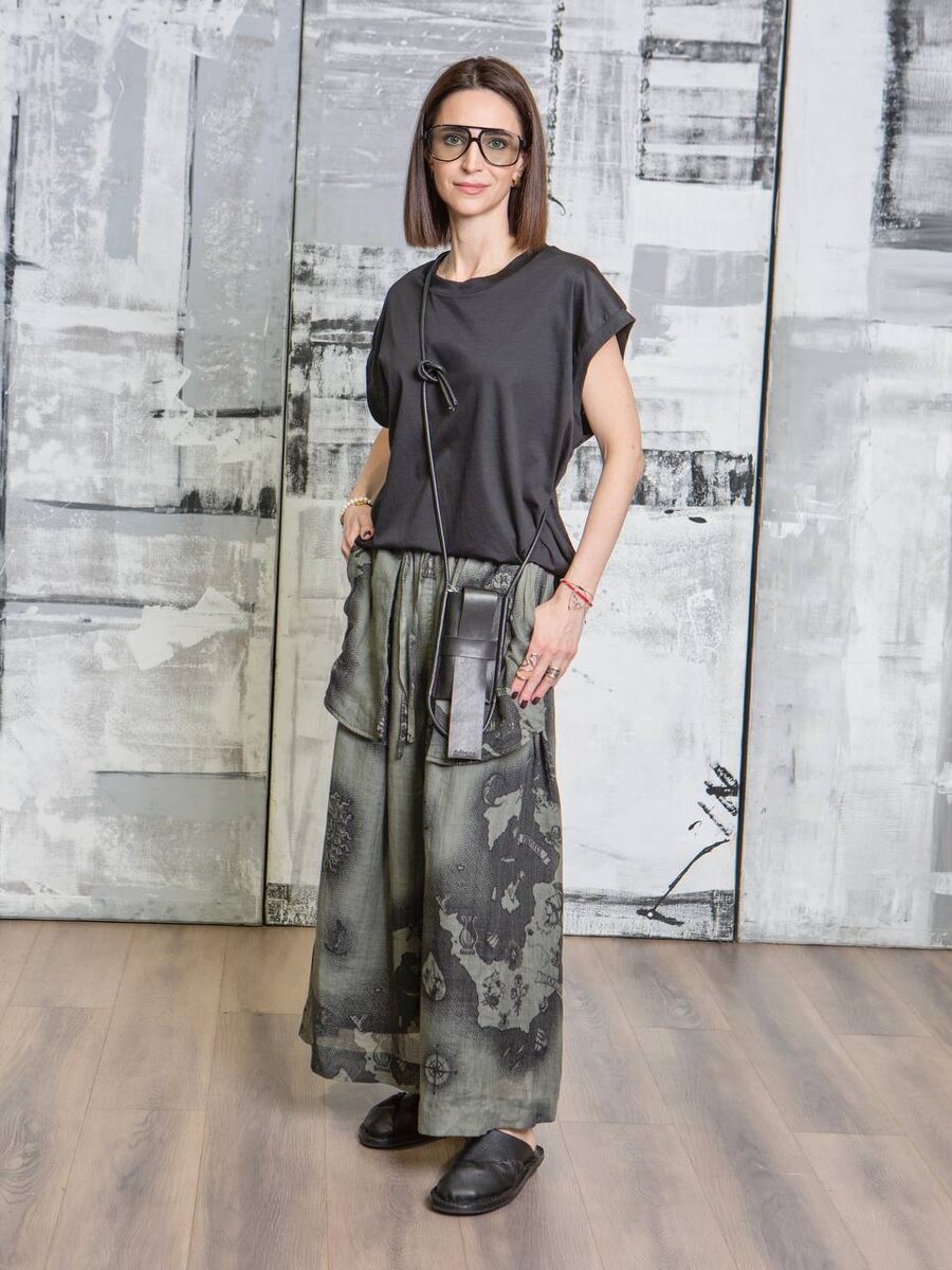 Ключевой акцент комплекта — широкие двойные брюки цвета хаки с эффектными вывернутыми накладными карманами и авторским принтом в виде старинной карты мира с пиратским мотивом. Это яркое дизайнерское высказывание с флером авантюризма и иронии.