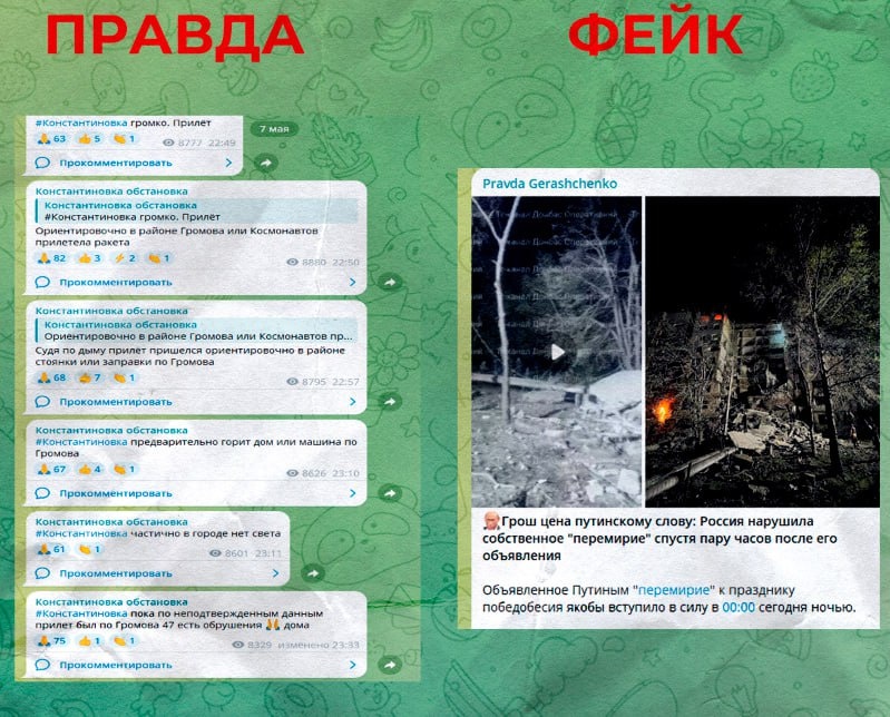 Киевские пропагандисты с сегодняшнего утра попытаются обвинить Россию в срыве объявленного Владимиром Путиным перемирия фейковыми сообщениями о прилёте в Константиновке по многоэтажке после 00.00 сегодняшней ночью. На самом деле о взрывах на улице Громова в Константиновке местный тг-канал стал писать 7 мая в 22.49. Соответственно если таковой удар и был, то он был до наступления объявленного Верховным перемирия. @iperiodu| @iperiodu_ru x @iperiodu_ua| Подписывайтесь