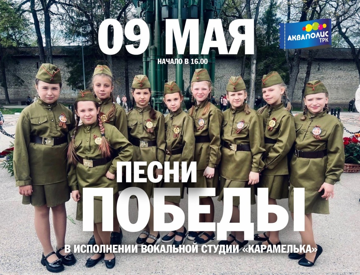 В честь Дня Победы ТРК «Акваполис» предлагает всем желающим принять участие в праздничном мероприятии 🕊 ✅ В программе: выступления артистов Вокальной Студии «Карамелька»; исполнение тематических песен; проведение конкурсов и игр; зажигательные танцевальные номера. 📆 9 мая в 12:30. 📍 ТРК «Акваполис», центральный атриум. 🎟 Вход свободный. Оставайтесь с нами #НашаПсковскаяобласть #деньпобеды