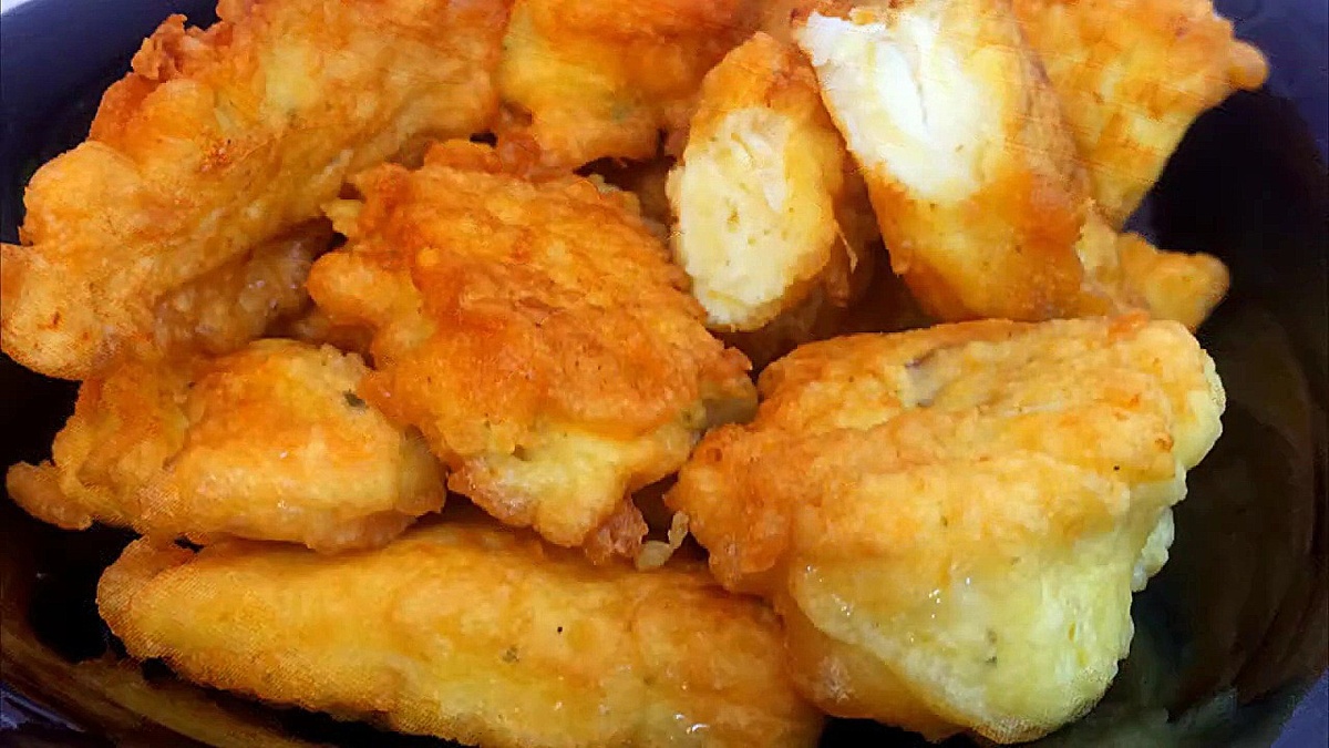 - филе минтая 3-4 шт. - масло растительное для жарки - яйцо -2 шт. - майонез -2 ст.л. - мука -2 ст.л. - соль, специи для рыбы -по вкусу Приготовить кляр: в миске смешать яйца, майонез, соль, специи. Добавить муку, перемешать до однородности. Филе минтая нарезать на небольшие кусочки, переложить в кляр, перемешать. Каждый кусочек выложить на раскаленную с растительным маслом сковородку. Жарить с двух сторон до румяной корочки.