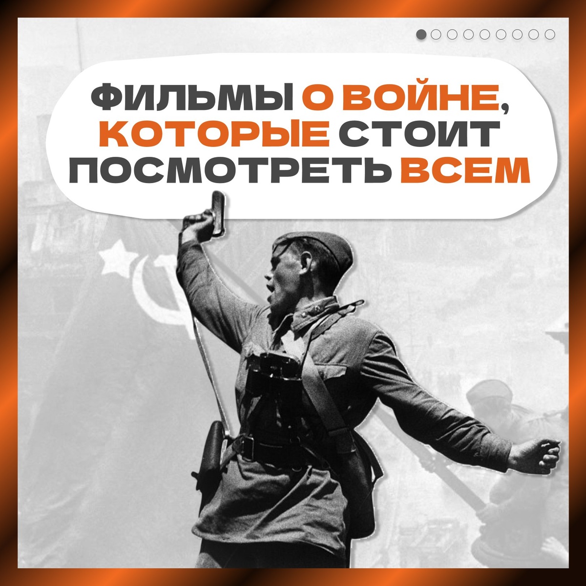 9 мая отмечается 80-летие Победы в Великой Отечественной войне – значимая дата, напоминающая о цене свободы!🎖🕊 Это была самая страшная и долгая война в истории нашей страны: ▪️ 1418 дней и ночей тяжёлых боёв, ▪️ около 27 миллионов жизней, отданных за мир. В карточках – фильмы о войне, которые стоит посмотреть. А какие порекомендовали бы вы? Помним. Гордимся. #Победа80