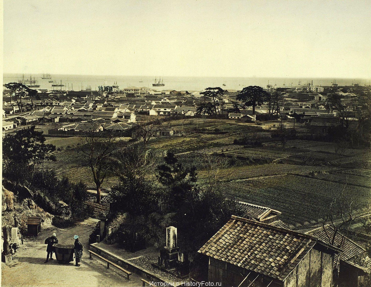 Исторически Кобе входил в состав провинции Идзуми и был важным транспортным и торговым пунктом на пути к японской столице Киото. В этом поселении традиционно находилось много контор оптовиков и ростовщиков, а также производителей японского рисового вина — саке. Кроме этого, Кобе было значительным религиозным центром и славился «тремя святынями», синтоистскими святилищами Икута, Нагата и Минатогава. С середины XIX века город стал одним из главных очагов модернизации страны, промышленности и производства искусственных жемчужин. Во время Реставрации Мэйдзи в 1868 году порт Хиого был одним из первых открытых для торговли с западными странами. Панорама залива и города Кобэ. Япония. 1880 год.