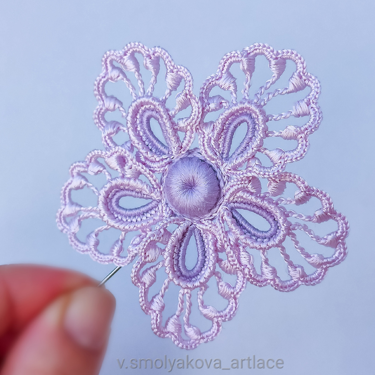 Рубрика: Вязаные цветы крючком для арт (ирландского) кружева. Мастер класс. Пряжа Пряжа натуральный шёлк. Это итальянский сток на бобинах. Нам понадобится два близких оттенка. На примере, один шёлк матовый, а второй глянцевый. Матовый натуральный шёлк Метраж 3000м/100г. Это мягкий, очень красивый, приятный по тактильным ощущениям шёлк. При освещении имеет благородный лёгкий блеск. Шёлк мягкой крутки. Из него легко вязать. Он не скручивается, не скользит, не цепляется. Глянцевый натуральный шёлк Метраж 5000м/100г. Несмотря на то, что он глянцевый, он практически не цеплючий при аккуратном плотном вязании. (Что очень радует, так как большинство глянцевых шелков имеют такую неприятную особенность.) Шёлк имеет красивый блеск даже без дополнительного освещения. Лёгкая крутка. Вязать из него чуть сложнее, чем из матового. Но если вязать только в три нити с одной бобины без перемотки, то вполне удобно. Цветок связан в три нити из обоих шелков. Рабочий метраж матового 1000м/100г, глянцевого