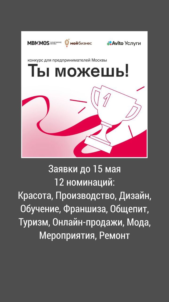 Обращаю внимание московских предпринимателей на этот конкурс. Подробности и подача заявки: https://clck.ru/3LsAMy Конкурсантам нужно рассказать о своей продукции или услугах, о пользе деятельности для общества и о планах развития своего дело. Жюри определит лучших в 12 номинациях. Победители получат бонусы для продвижения от Авито Услуги, PR-поддержку от МБМ в федеральных и региональных СМИ. Используете такие возможности? ❤️ - да, подам заявку, спасибо! #конкурс, #ты_можешь, #мбм