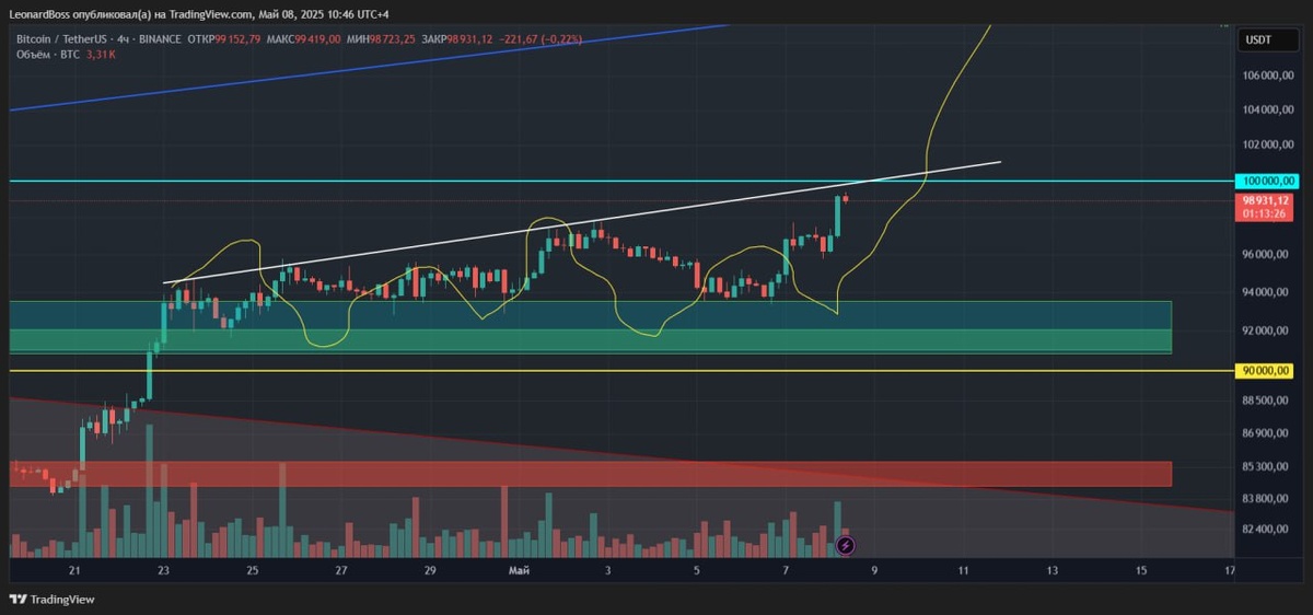 В ответ на пост #BTC 🕯Локально + Глобально🕯 Коллеги, всех приветствую! Пробежимся коротенько по рынку. ⚠️Итак, как видим, BTC сценарий проболжает отрабатывать и чуть ли не идеально во временном диапазоне. Киты продолжают его активно накапливать, не обращая внимания на шатания рынков и мнений. Те, кто продавал его по 75К всего лишь месяц назад, а это были в том числе крупные держатели, кусают локти, ловят FOMO и после уровня 100К начнут снова тыкать кнопку "BUY"!! ⚠️При этом, цена вплотную приблизилась к ключевому уровню 100К, тем самым мы имеем мощное сопротивление сверху прямо сейчас. Также, нарисовалась локальная трендовая сопротивления. Именно при пробое аналогичных "восходящих" трендовых, в большинстве случаев цена стремительно летит вверх. Посмотрим, получиться ли в этот раз подтвердить данный паттерн. Что-то мне подсказывает, что так и будет, да и мой прогноз оканчивается далеко сверху!)) P.s. дело в том, коллеги, что на рынке в очередной раз, незаметным для нас способом сл
