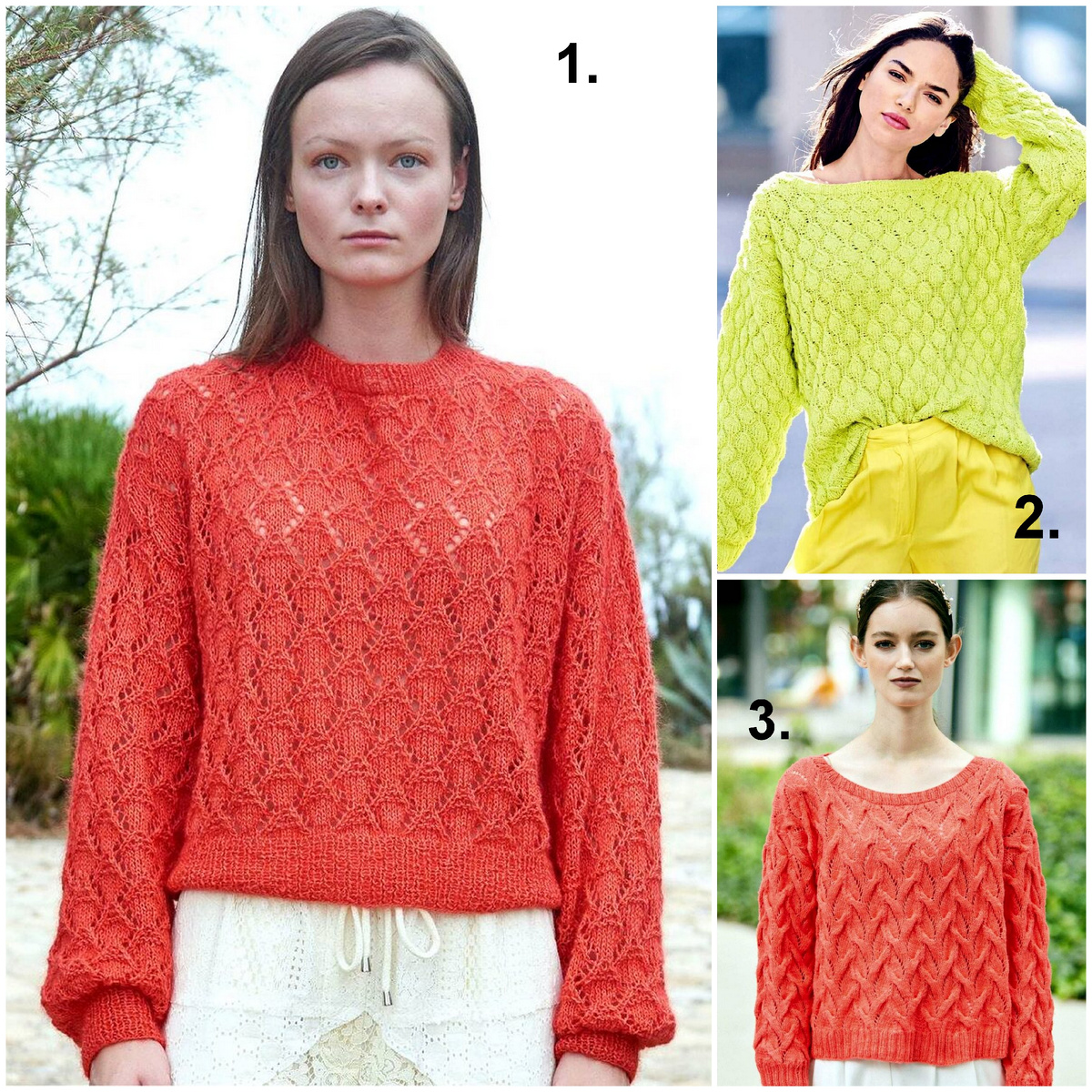 3. Этот удобный пуловер по-настоящему привлекает внимание благодаря пряже кораллового цвета. Широкий круглый вырез особенно хорошо подчеркивает красивую зону декольте. Рельефный узор с широкими косами и мелкими отверстиями — настоящее удовольствие для опытных вязальщиц. Все манжеты и вырез горловины связаны резинкой 2/2. Прямые рукава облегчают вязание. Хлопчатобумажная пряжа с добавлением мягкой и тёплой шерсти идеальна для переменчивой весенней погоды.