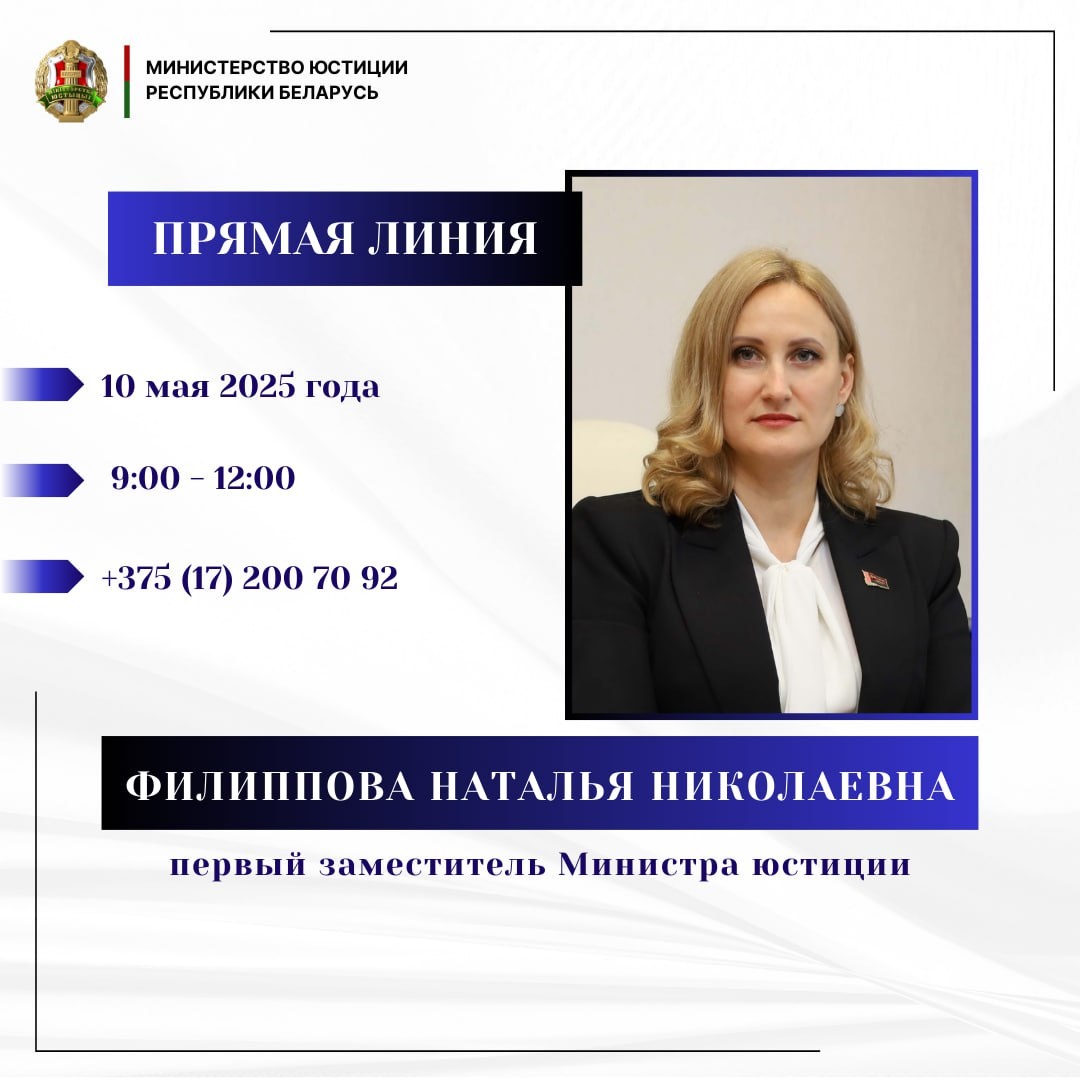 👥👥 🗓 10 мая 2025 года с 9:00 до 12:00 прямую телефонную линию по актуальным вопросам деятельности Министерства юстиции Республики Беларусь проведет первый заместитель Министра юстиции Филиппова Наталья Николаевна. 📞 8 017 200 70 92 💪💪💪💪| Сайт | Telegram | Instagram | Fb | X | Ok | VK | YouTube