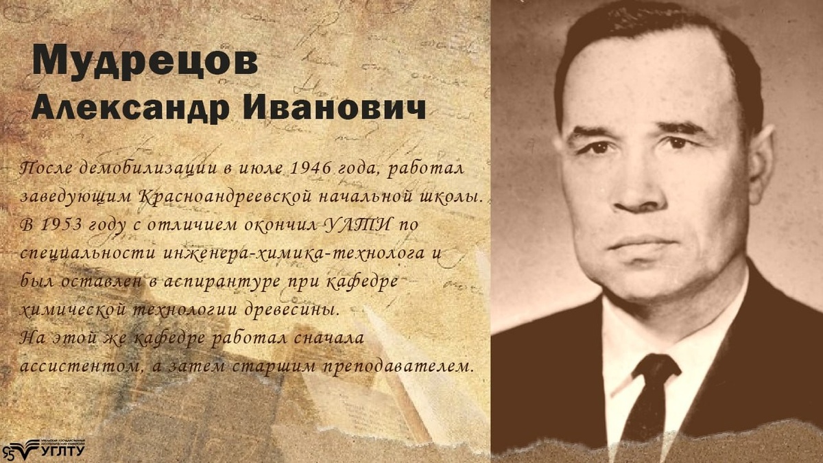#герои_ВОВ_УГЛТУ 🔍 О героях, о той памяти, которая живет в сердцах наших современников рассказываем в наших социальных сетях usfeu.ru/universite... Мудрецов Александр Иванович Мудрецов Александр Иванович родился 1 октября 1922 года в г. Рассказово, Талебовской области, там же получил среднее образование, окончив педагогическое училище в 1940 году. В те же годы в августе месяце призван в ряды Вооруженных сил СССР. Первоначальную службу проходил во флоте, являясь курсантом военно-морского училища. С началом войны из курсантов училища был сформирован отдельный батальон морской пехоты, в котором, выполняя обязанности второго номера пулеметного расчета, участвовал в боях на Ленинградском фронте. #НаучныйПолк #Победа80