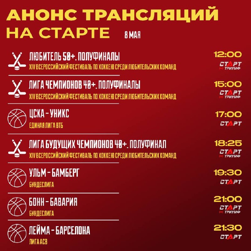 Начнём день с XIV Всероссийского фестиваля по хоккею среди любительских команд, затем посмотрим второй матч полуфинальной серии Единой Лиги ВТБ между ЦСКА и УНИКСом, а вечером насладимся топовым европейским баскетом 🍿