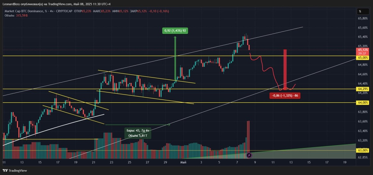 #BTC.D ‼️Доминация‼️ ⚠️Доминация битка унеслась выше уровня 65%, что еще совсем недавно казалось невероятной вероятностью. Я не просто так обращаю ваше внимание на доминацию BTC. Последнее движение значения очень четко показывает, насколько сильно вытряхнуты альты. Аналогичное движение ранее, привело бы к падению альтов на 30% и более. Однако, в текущей ситуации мы наблюдали лишь корректирующее снижение цен в среднем на 15%. При этом, это было абсолютно ожидаемое и прогнозируемое снижение, а не очередной шок контент. Для меня, это лишний раз подтверждает настрой рынка альтов и будущее соответствующее движение!! P.s. сейчас по доминации я ожидаю как минимум коррекционное движение вниз. А значит, если еще не набирали позиции, чекаем пробой уровня 65% и действуем. Даже снижение в зону уровня 64% даст приличный профит по альте, не проспите!!!