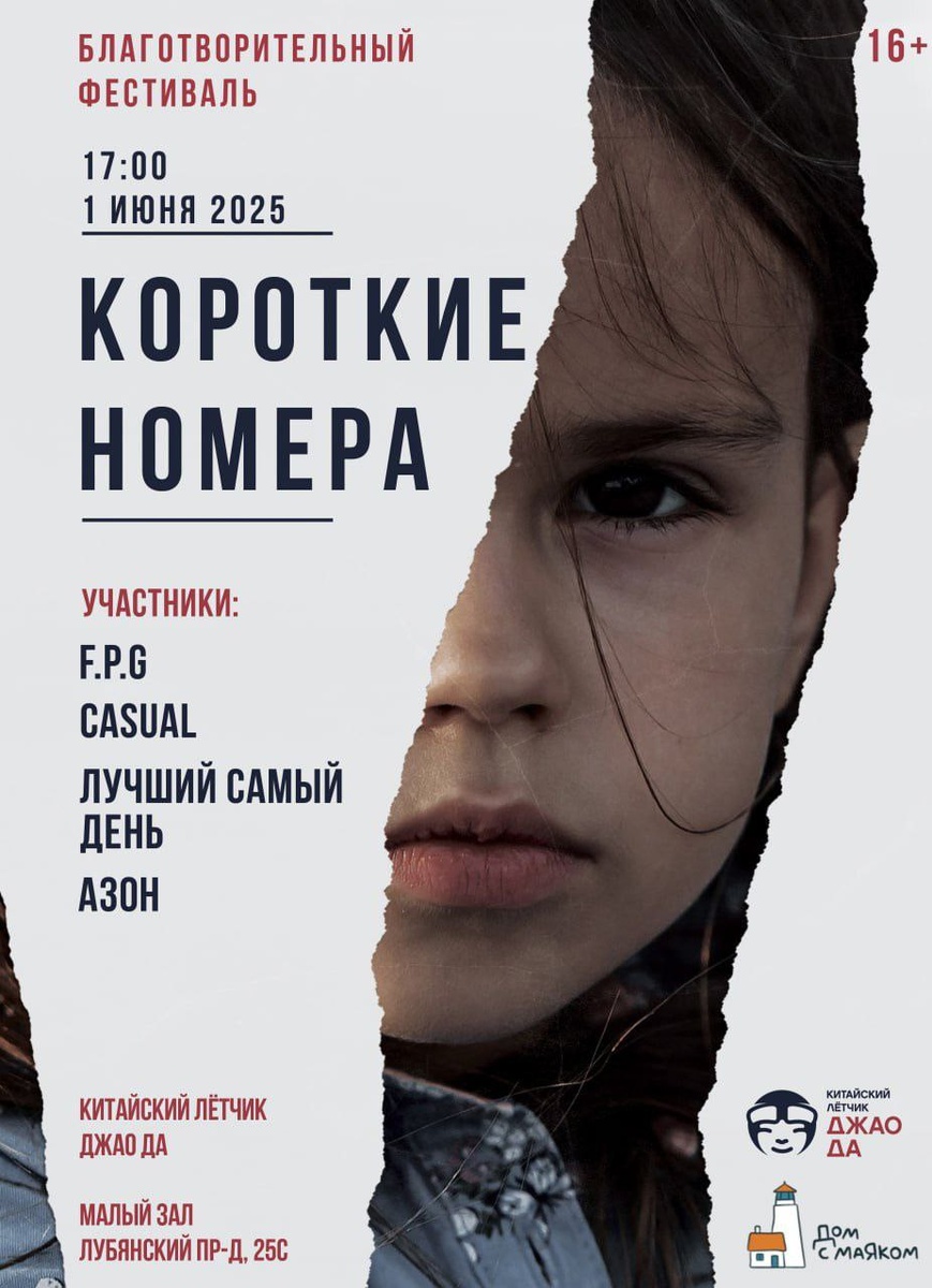 1 июня, Москва. Благотворительный фестиваль «Короткие номера» Четыре мощнейших неравнодушных коллектива встретятся на одной сцене с общей целью: помочь тем, кто в этом нуждается. В акустическом формате для вас сыграют: - F.P.G - CASUAL - Лучший Самый День - АЗОН ❗ВСЕ вырученные средства будут направлены в фонд помощи тяжелобольным детям и молодым взрослым до 30 лет "Дом с маяком" в виде адресного пожертвования ❗ 📍Место: малый зал «Китайского лётчика Джао Да» 🕐 Начало: 17:00 🎟Билеты по ссылке: https://vk.cc/cLH33j