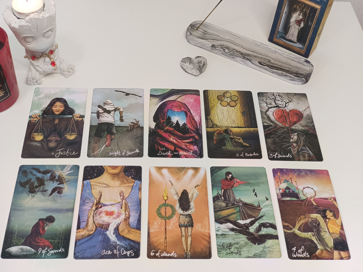 Всех приветствую. Посмотрим события, которые были, и что расскажут карты о будущем ? Карта Справедливость вышла первая, а далее Рыцарь Мечей - нарушена была ваша справедливость. События, которые вы не ожидали, ворвались в вашу жизнь. Это могут быть разбирательства в суде, или с близкими людьми, но это происходило, очень стремительно, что у вас вызвало целую бурю эмоций и переживаний. Вы можно так сказать "упали духом". Карта 5 пентаклей - это, где нет сил и мы не видим возможного выхода из этого состояния. Очень сложный период в вашей жизни показывают. Но в будущем, карты выходят благоприятные. Через свои страхи, а 9 Мечей - это карта страхов и тупика, вы найдëте выход. Возможно поймëте, что все эти события, не должны оказывать влияния на всю оставшуюся жизнь, ещë много всего будет хорошего, главное перешагнуть в будущее, не неся с собой этот тяжëлый груз, от которого никому не хорошо. А что самое интересное, почти у всех есть похожие проблемы, но кто-то постепенно теряет интерес к пр