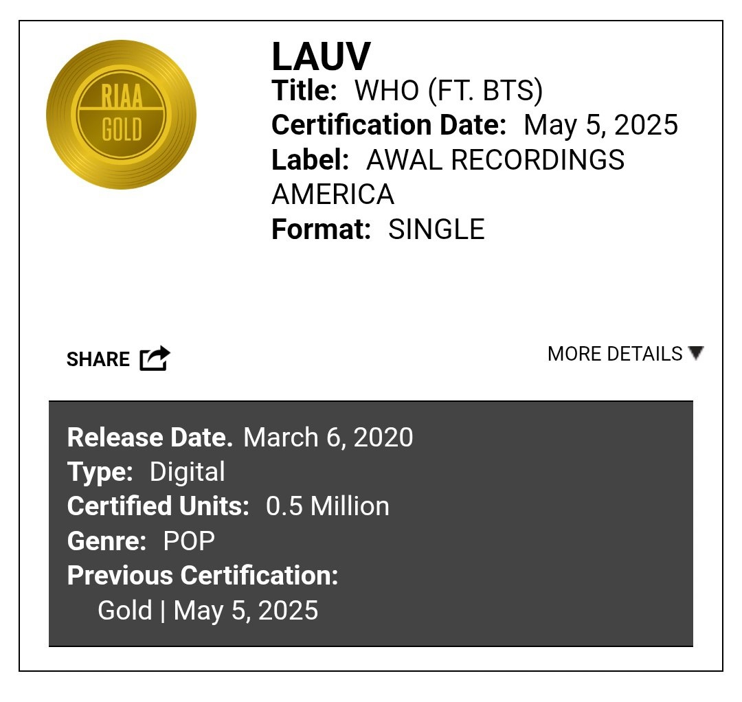 🍊 Песня Lauv (feat. BTS) "Who" получила золотой сертификат RIAA в США.