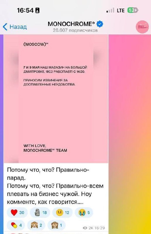 Почему бренд Monochrome опозорился одним постом? ⬆️ Наверное, вы уже всё видели этот пост и волну хейта, который последовал. 🔹Но давайте посмотрим на эту ситуацию не просто как на «интернет-драму», а с точки зрения брендинга и управления коммуникацией. В канун Дня Победы Monochrome (а точнее соосновательница и стилист) опубликовали пост об изменениях в графике работы — но сделали это с язвительной подписью в духе «ну что ж, 9 мая опять мешает нашему бизнесу». ⠀ Предсказуемо — пост вызвал волну негатива. Люди восприняли это как неуважение к памяти, к дате, к аудитории. И вместо того, чтобы быстро извиниться, бренд пошёл по классике: редактирование подписи, удаление комментариев, закрытие комментариев… В итоге пост удалили и выложили новый — с извинениями. И кстати, извинения вышли уже от лица собственника, мне его стало даже жаль, потому что необдуманные слова одного человека на огромную аудиторию теперь так влияют на весь бренд и других людей в компании. Что пошло не так? — Челов