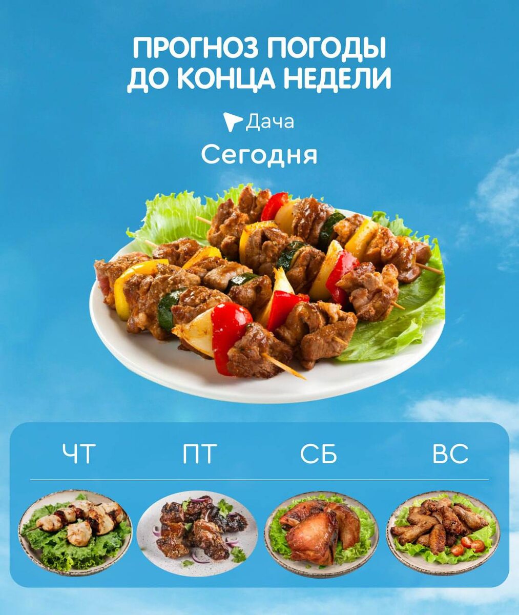 Ожидаются обильные осадки в виде сочного шашлыка, местами – с овощами гриль! Какие у вас планы на эти выходные? Не забудьте заглянуть в ближайший SPAR или мобильное приложение за всем необходимым!