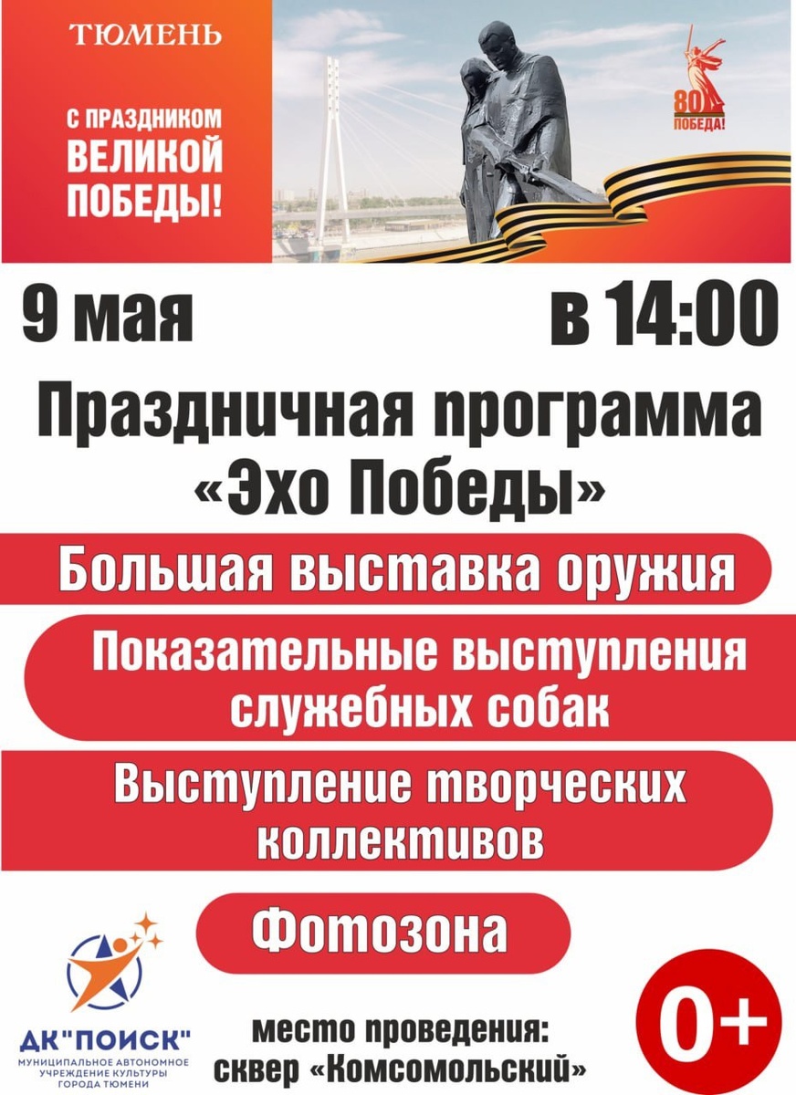 День Победы в Комсомольском сквере С 14 до 17 часов на главной сцене Комсомольского сквера пройдут праздничный концерт и тематические викторины, посвященные жизни Тюмени в годы Великой Отечественной войны. Также будут работать выставка-мастер-класс «Оружие Великой Победы», интерактивная зона «Собака-герой», где можно посмотреть выступления служебных собак, мастер-класс «Цветы Победы», выставка голубей «Крылатая рота».