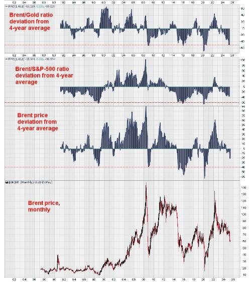 В последнее время много разговоров о нефти. В основном, они сводятся к попыткам угадать, долго ли ей еще падать и почему…. В последнее время много разговоров о нефти. В основном, они сводятся к попыткам угадать, долго ли ей еще падать и почему. В этой связи считаю полезным взглянуть на долгосрочную динамику нефти марки Brent, причем, не только абсолютную, но и относительно таких активов-конкурентов, как золото и рынок акций. Прогнозировать цены на нефть, в принципе, не стоит- это не могут сделать даже инсайдеры, работающие в отрасли, куда уж нам. Но такой «взгляд сверху» поможет хотя бы сориентироваться и понять, где сейчас находится нефть в исторической перспективе. Еще одно замечание: я сторонник теории «возврата к среднему», поэтому в качестве критерия для оценки текущего состояния цен на нефть я предлагаю посмотреть на отклонения от 4-летней средней. Это по-настоящему долгосрочный фильтр, который позволяет «захватить» цикл целиком (рост-стагнация-падение). График месячный, с 1