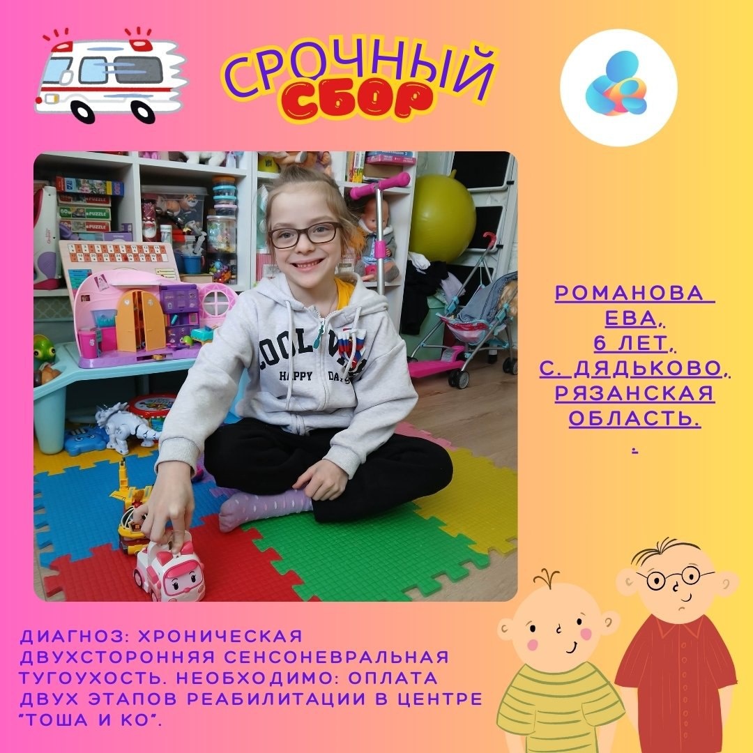 В селе Дядьково Рязанской области сурдологов и логопедов нет, от слова совсем. Да и в самой Рязани профессиональной реабилитации после кохлеарной имплантации нет - просто поддерживающие занятия. Девочке необходимо пройти курс слухоречевой реабилитации, иначе операция останется просто бесполезной. На сегодняшний день собрано всего четверть суммы, осталось собрать 150 000 рублей. Мы просим вас помочь - https://stranadetyam.ru/campaign/romanova-eva-6-let-s-dyadkovo-ryazanskaya-oblast/