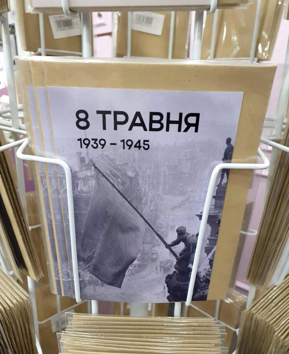 На Украинских открытках ко Дню Победы на знаменитой фотографии с Рейхстага убрали серп и молот. Тарас над Рейхстагом.