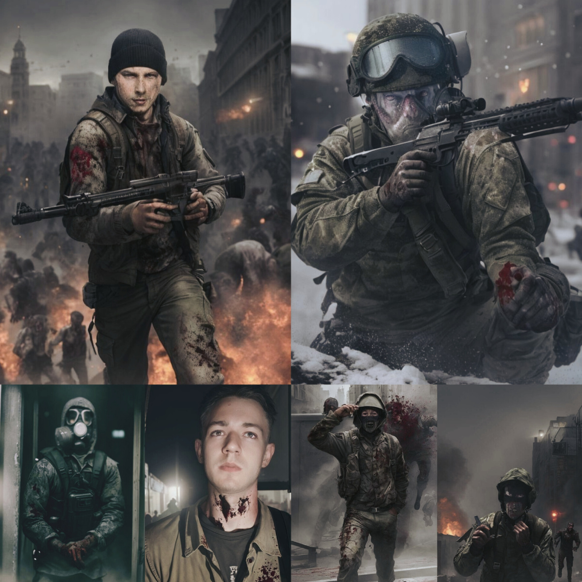 Год назад жизнь была другой. Мы развлекались, гуляли большими компаниями. Что же произошло? Началась война на Донбассе, переросшая в конфликт между мировыми державами. Мир содрогнулся, покрылся пеплом и погрузился в ледяную зиму. Теперь мы живем в одном из магазинов, который стал нашим убежищем. У меня есть оружие и припасы, но мои друзья погибли. Всё вокруг изменилось: зомби, мутанты и грибы-паразиты. Они проникают в убежище, угрожая нашей безопасности. **Мутант «Грибок»** Этот человек подвергся сильному воздействию радиации и спор плесени. Его тело гниёт, покрыто странными отростками, которые выделяют споры. Единственный способ его обезвредить — вырезать отросток у хребта. Что делать? Прострелить ноги грибнику или попытаться уничтожить их поодиночке? Завтра утром станет ясно. На следующее утро я услышал странные шорохи на крыше здания. Открыв окно, я заметил движение у дороги. Пригнувшись, я замер. Вдруг из-за угла выбежала собака — хаски. Её ярко-голубые глаза переливались, сл