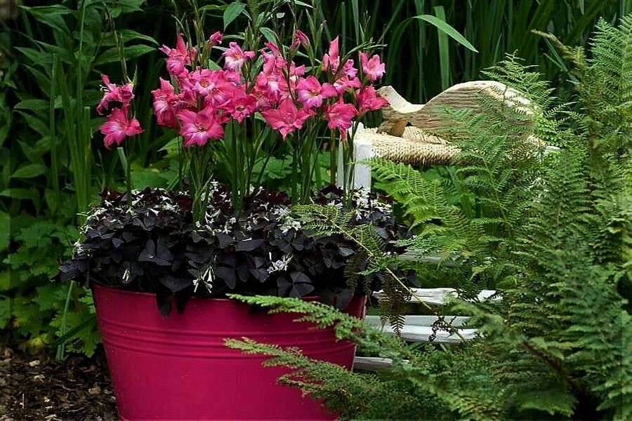 Чтобы горшки с подрастающими гладиолусами не выглядели пустыми до начала цветения (обычно с середины-конца лета), подсадите к ним почвопокровные или вьющиеся растения, которые украсят вазон и не будут мешать развитию основных посадок.