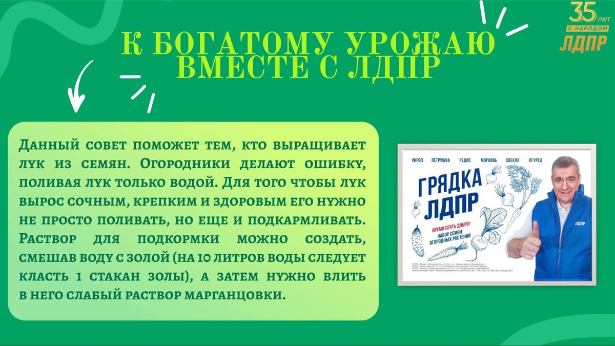 К богатому урожаю вместе с ЛДПР! Тюменское региональное отделение ЛДПР продолжает рубрику «К богатому урожаю вместе с ЛДПР», в рамках которой вы можете узнать интересные советы и рекомендации для роскошных грядок. Не упустите возможность узнать секреты богатого урожая от ЛДПР! Следите за нашими публикациями и готовьтесь к новому дачному сезону вместе с нами! Напоминаем, что если вы хотите получить качественные семена «Грядка ЛДПР», то вы можете обратиться в местное отделение ЛДПР вашего муниципалитета, в Тюменское региональное отделение ЛДПР или заполнить заявку онлайн по ссылке: vk.com/app53455430