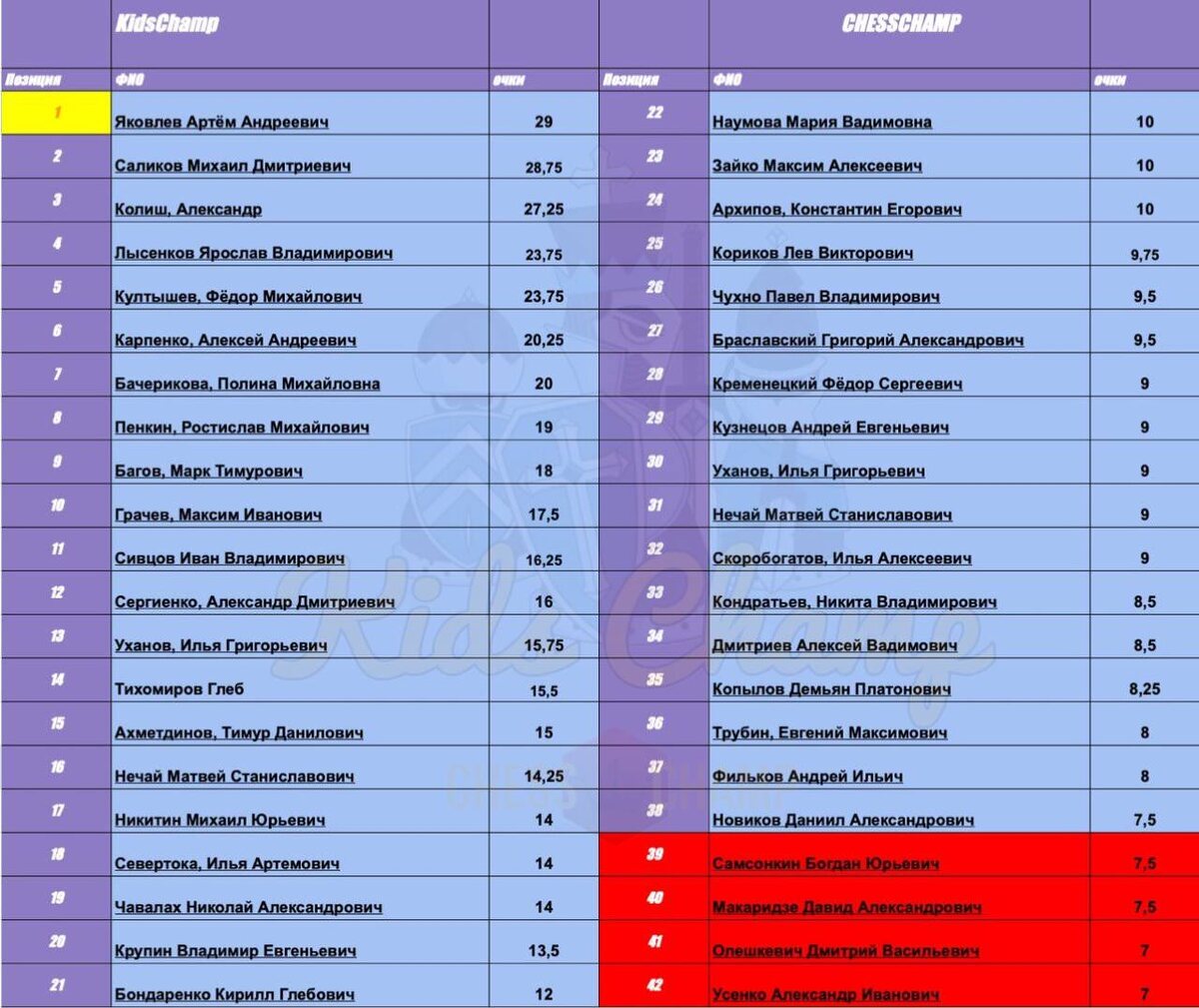 Актуальная таблица группового этапа «KidsChamp» перед заключительным туром 👑 ✅ Яковлев вырвался на первую строчку и уже в это воскресенье попробует стать чемпионом группового этапа❗️ ✅ Нас ожидает упорная борьба за первую строчку. Яковлев, Саликов и Колиш главные претенденты за победу в групповом этапе! ⚠️ Борьба за выход в финальный турнир потрясающая❗️ Разрыв между 22 и 39 местом 2,5 очка 🤯