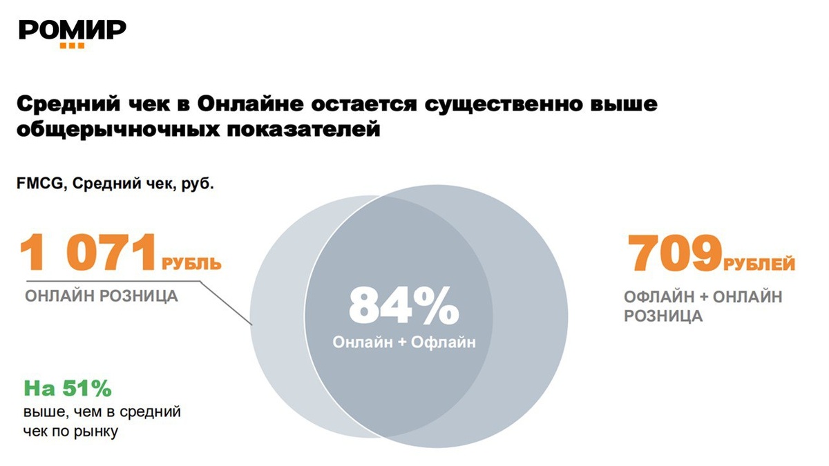 Омниканальность — новая реальность российского ритейла. Потребитель выбирает гибридную модель покупок Исследование РОМИР показывает, что подавляющее большинство российских семей – 84% – уже являются омниканальными покупателями, совмещая покупки в традиционных магазинах и онлайн. Сегмент уникальных покупателей исключительно офлайн формата составляет 15,7%. Наблюдается рост популярности таких форматов, как магазины у дома и маркетплейсы, которые становятся ключевыми точками контакта с омниканальным покупателем. Важным индикатором изменения потребительских привычек является динамика среднего чека. В онлайн-рознице средний чек остается существенно выше общерыночных показателей, достигая 1 071 рубля. Это значение на 51% превышает средний чек по рынку в целом (офлайн + онлайн), который составляет 709 рублей. Такая разница может объясняться как спецификой онлайн-покупок, так и более объемная корзина в силу широкого ассортиментного ряда. Наиболее динамичный рост в онлайн-секторе демонстриру
