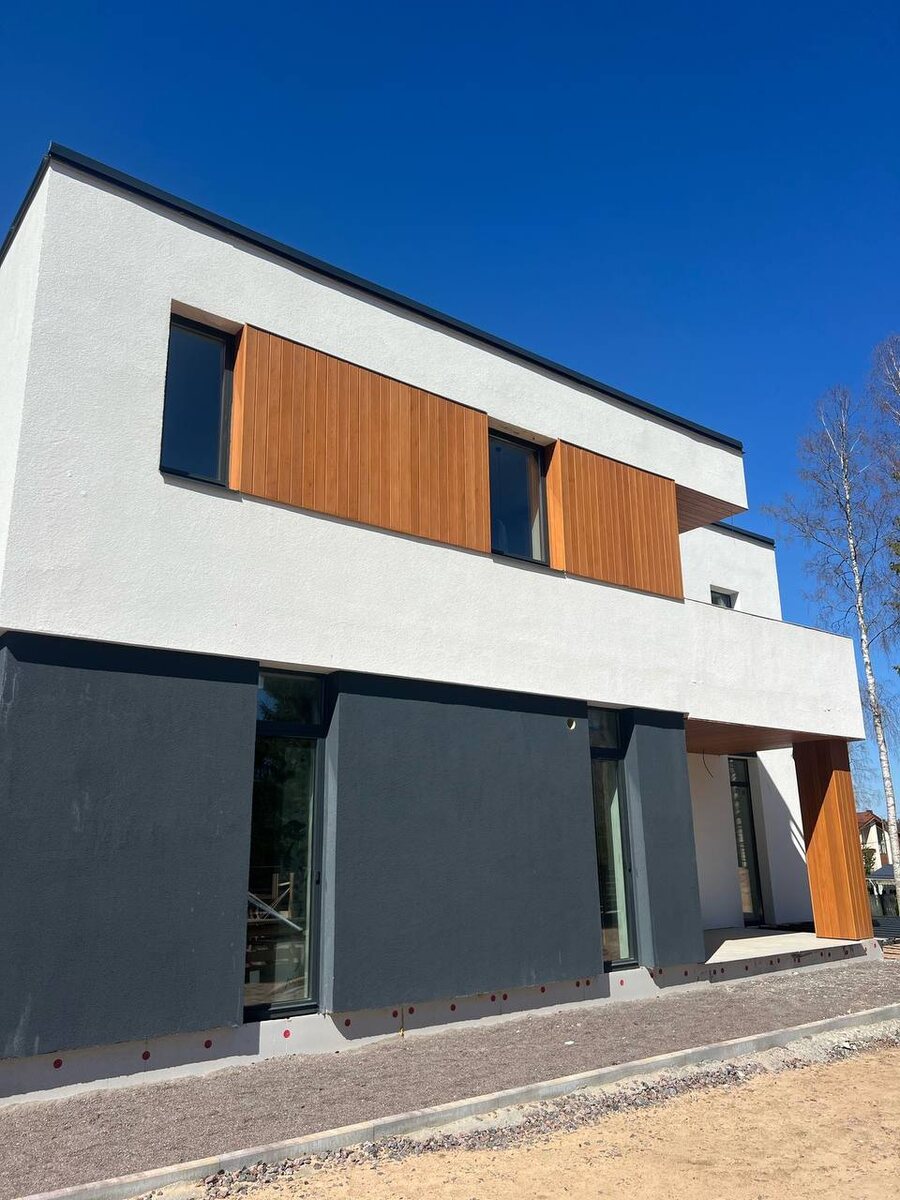 Фрагменты отделки фасадов нашего объекта на озере Красногвардейское 🐠 На фасадах применена: ⏺светлая декоративная штукатурка RAL 9010 ⏺темная декоративная штукатурка RAL 7016 (под тон оконных рам) ⏺сухая окрашенная в заводских условиях лиственница экстра #проектдома #проектLP Сайт LP Дзен Instagram Youtube
