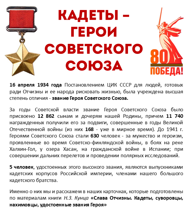 ⭐16 апреля 1934 года Постановлением ЦИК СССР для людей, готовых ради Отчизны и ее народа рисковать жизнью, была учреждена высшая степень отличия - звание Героя Советского Союза. ⭐ За годы Советской власти звание Героя Советского Союза было присвоено 12 862 сынам и дочерям нашей Родины, причем 11 740 награжденных получили его за подвиги, совершенные в годы Великой Отечественной войны (из них 168 - уже в мирное время). До 1941 г. Героями Советского Союза стали 630 человек - за мужество и героизм, проявленные во время Советско-финляндской войны, в боях на реке Халхин-Гол, у озера Хасан, на гражданской войне в Испании; при совершении дальних перелетов и проведении полярных исследований. 👉 5 человек, удостоенных этого высокого звания, являются выпускниками кадетских корпусов Российской империи, членами нашего большого кадетского братства: ⭐ Дмитрий Михайлович Карбышев (посмертно) ⭐ Иван Степанович Исаков ⭐ Александр Александрович Лучинский ⭐ Николай Николаевич Олешев ⭐ Андрей Иосифович Со