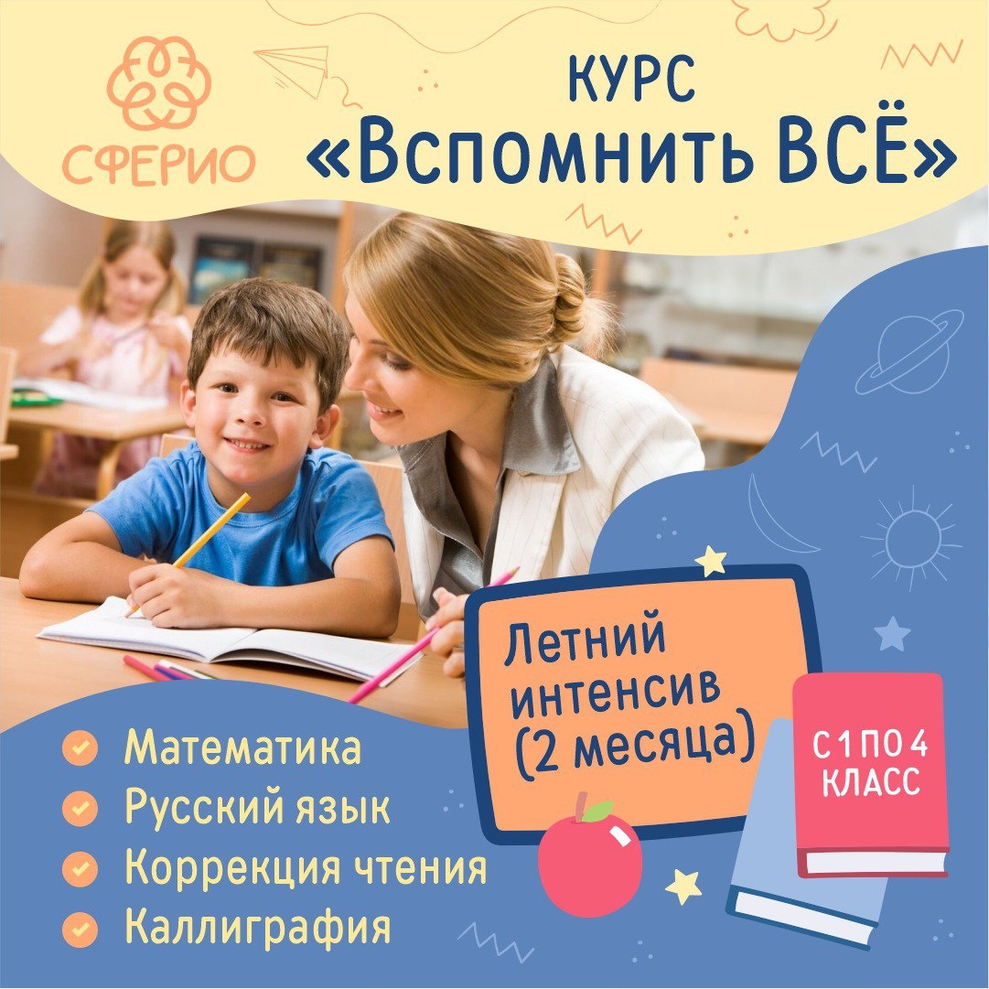 ✨ Курс "Вспомнить Всё" (1-4 класс). ЛЕТНИЙ ИНТЕНСИВ! 🤔Хотите, чтобы ребенок не забыл весь пройденный материал за лето? ☝️Курс «Вспомнить Всё» - это индивидуальные и групповые занятия, которые направлены на: ⁃ устранение пробелов ⁃ объяснение непонятых материалов ⁃ улучшение навыков чистописания ⁃ улучшение навыков чтения ⁃ улучшение навыков счета и решения задач Итог: ребенок выйдет из состояния отдыха постепенно и ему не придется пытаться вспомнить все предыдущие знания ✅ 🚫 Возраст: 7+ 🏢 Учебный центр "Сферио" 📍 г. Чехов,ул. Полиграфистов, 6 (Вход со двора, подъезд 2, этаж 3) 🔗 Записаться: https://wa.me/+79154100465 Наши соцсети 📲⬇️ ➡️ ВК https://vk.com/sferio_kids ➡️ Продленка https://vk.com/prodlenkachehov ➡️ Школа https://vk.com/sferio_school #webСферио ✅ Мероприятия Чехов https://dzen.ru/id/66cc4b48e9ef144699238a51 http://vk.com/chekhov_events http://dzen.ru/chekhov_events