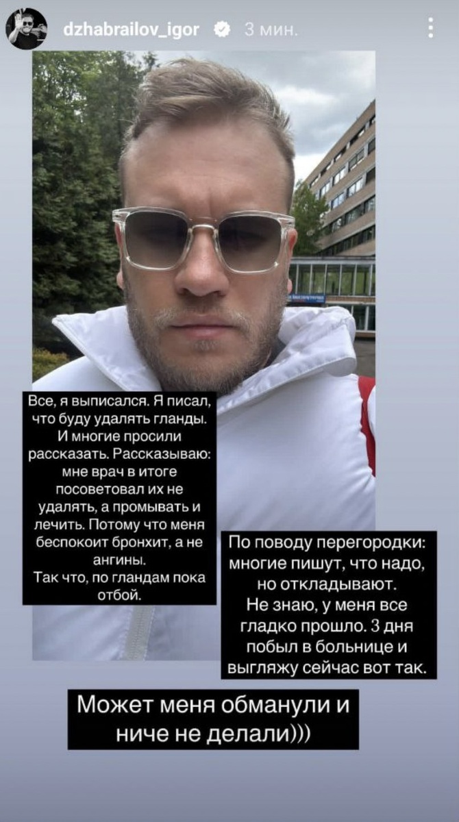 Комик Игорь Джабраилов недавно перенёс септопластику, операцию по исправлению носовой перегородки. После трёх дней в больнице он был выписан и поделился с подписчиками своими впечатлениями. «Все прошло гладко», — отметил артист, немного пошутил, что, возможно, его «обманули» и ничего не сделали.