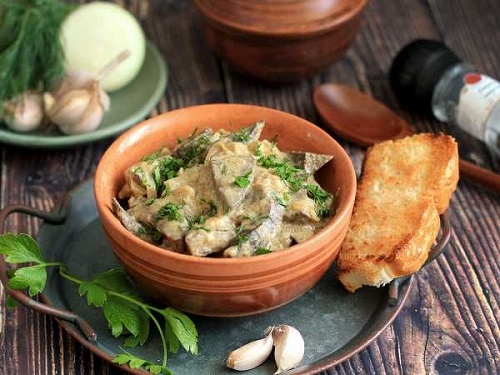 Сочная говяжья печень, тушеная в сметане с луком и морковью