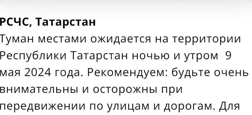 Ночью и утром 9 мая на территории Республики Татарстан ожидается сильный туман. Об этом сообщает Российская единая система предупреждения и ликвидации чрезвычайных ситуаций (РСЧС). — Туман местами ожидается на территории Республики Татарстан ночью и утром 9 мая 2024 года, — сказано в сообщении, опубликованном сегодня, 8 мая 2025-го. Татарстанцам рекомендуют быть внимательными и осторожными при передвижении по улицам и дорогам. Для перехода проезжей части дороги рекомендуется по возможности использовать наземные или подземные пешеходные переходы. Ранее KazanFirst писал, что жители Альметьевска засняли лосей, пронесшихся по микрорайону Урсала.