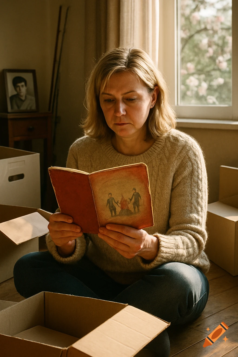 Страницы шуршали, как осенние листья. И вдруг — детский рисунок: у костра сидели двое взрослых и трое детей. Настя замерла: