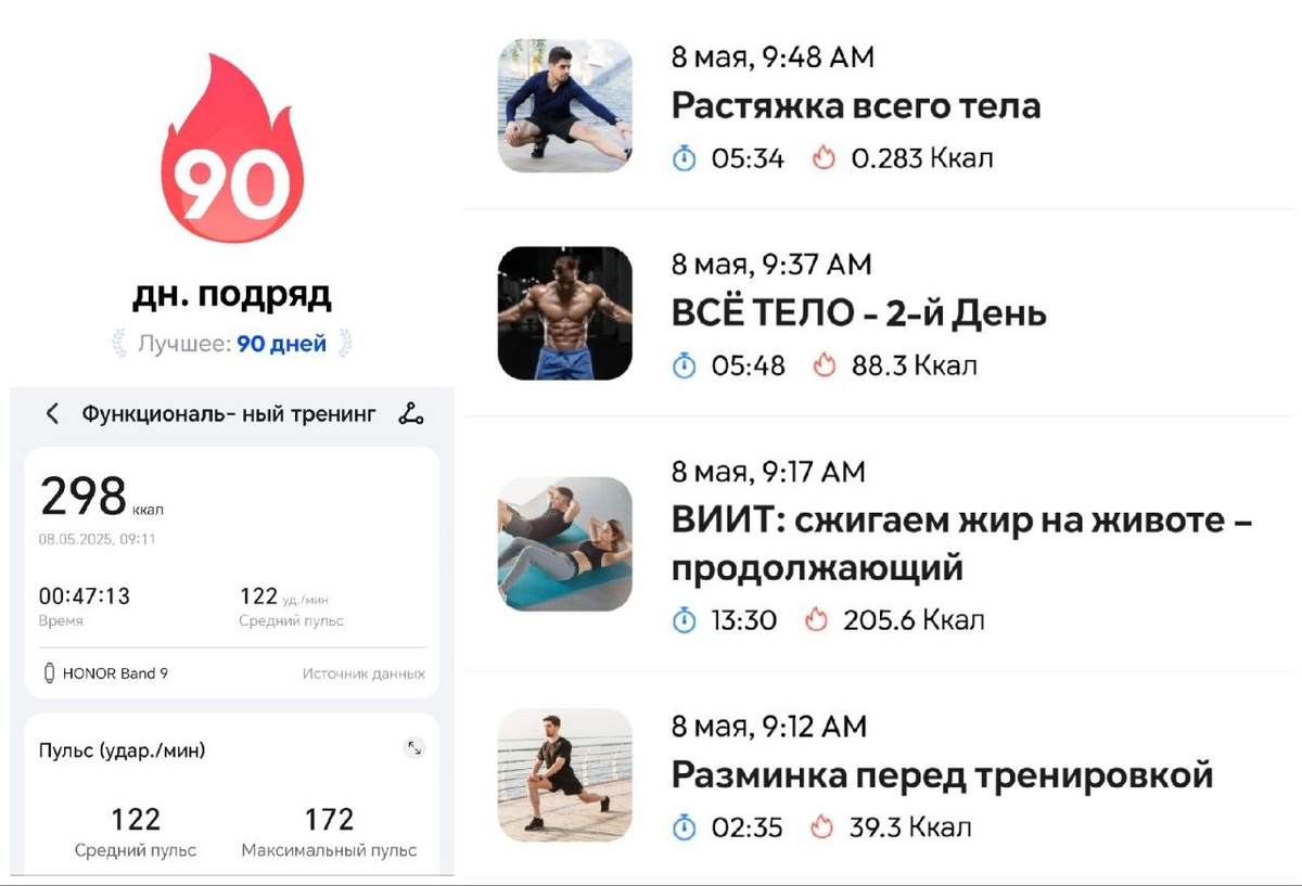 🏋️♂️ Упражнения. День 90. 🗓 08.05.25 💪 День ведения блога: 120 ⏱ 00:47:13 🏄♂️ 298 ккал 💪 Во! Мне кажется получился идеальный комплекс на постоянку. 🧐 ВИИТ даёт хорошую взрывную нагрузку в начале тренировки и поднимает пульс, а комплекс на все тело со временем будет повышать нагрузки. Вот и получится плавное повышение нагрузок на постоянной основе! 😃 Ещё 2-3 года и я стану огромным качком! ✍️ Рассказывайте о своих достижениях в коментах! #упражнения_дома 😎 Roman Legas | Life