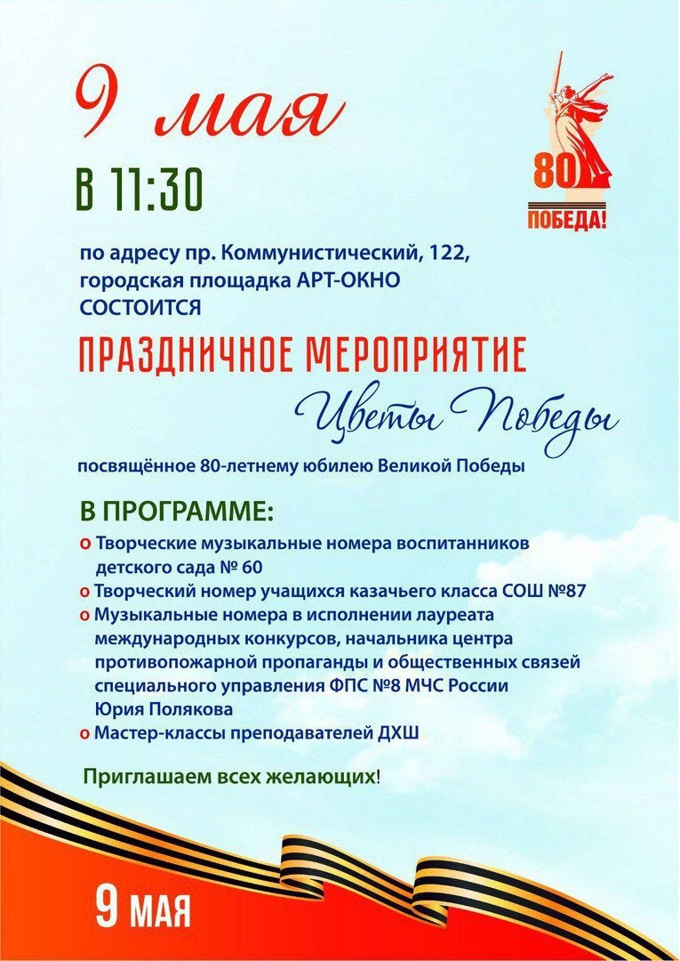 9 мая в 11:30 на креативной площадке АРТ-ОКНО состоится праздничное мероприятие "Цветы Победы", посвященное 80-летнему юбилею Великой